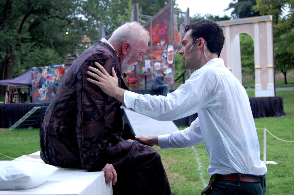 Actors Shayne David Cameris and Michael Sinkora in Siena College's Endgame (Design by Colin McIlvaine, Lighting by Greg Solomon, Costumes by Denise Massman).